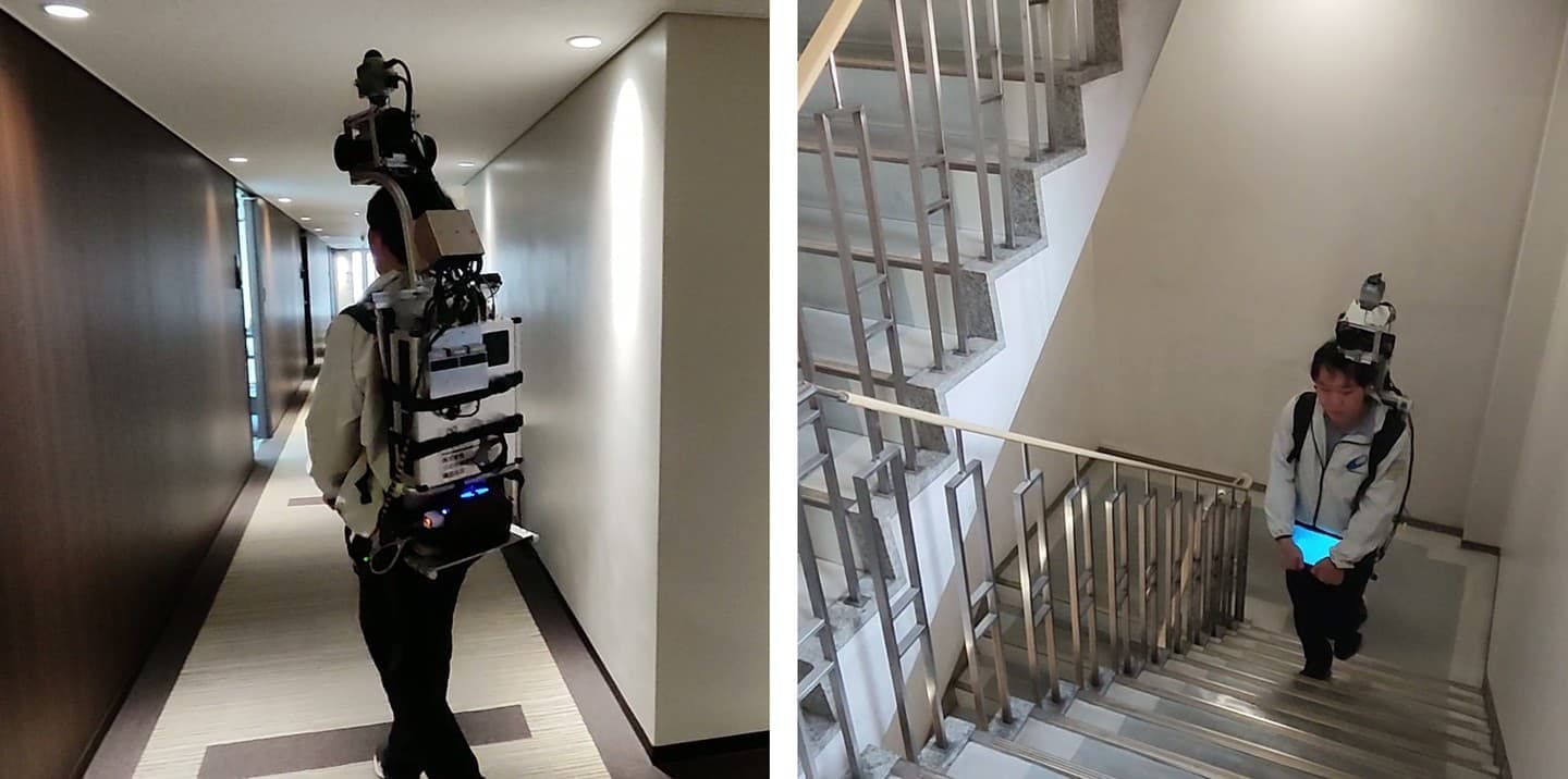 当社の独自開発装置をご紹介します。 Walk-Gは、3DLiDAR、カメラ、各種センサを搭載したバックパック型計測装置です。